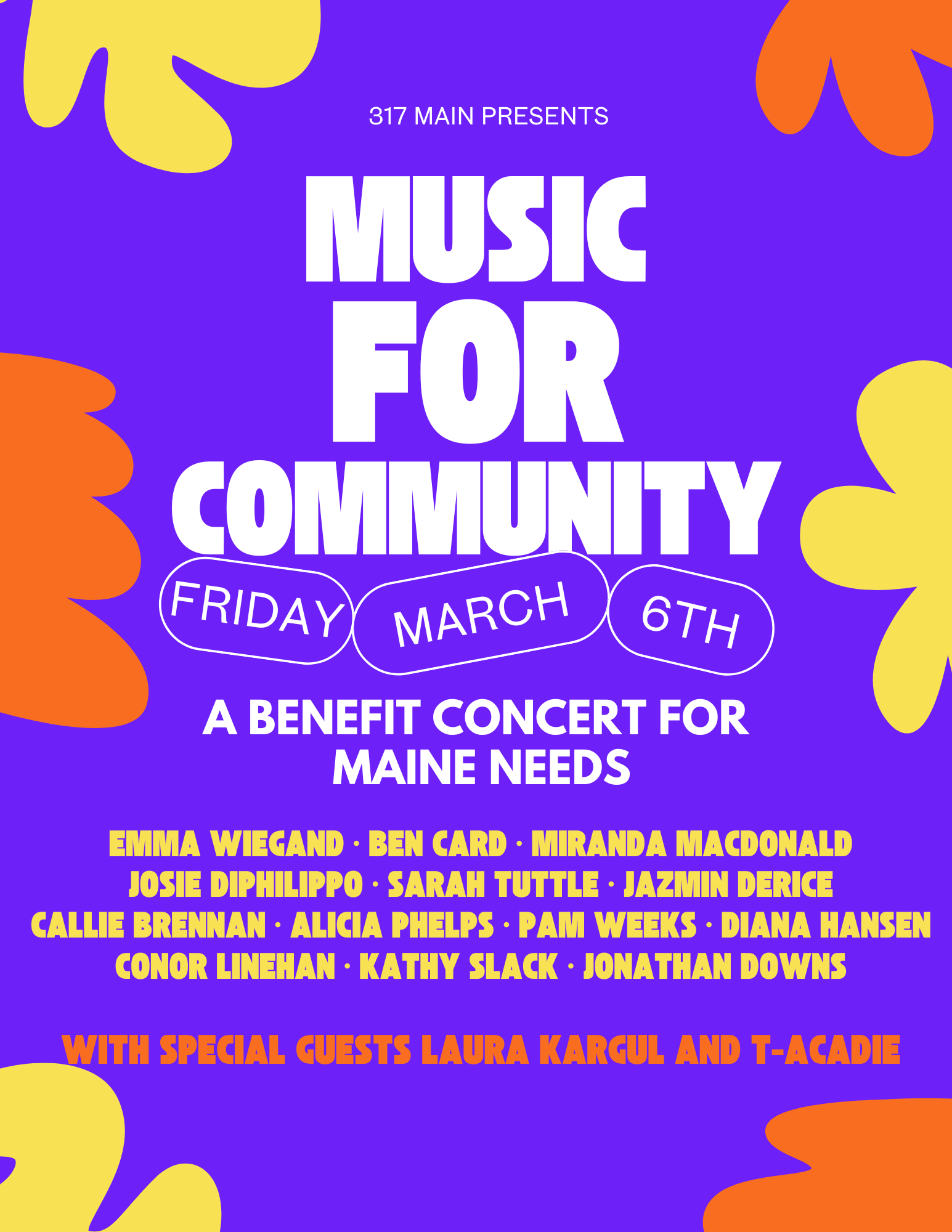 On Friday, March 6 at 6:30pm, 317 Main’s Teaching Artists and staff come together for a special benefit concert supporting Maine Needs, a statewide nonprofit serving asylum seekers, students, the unhoused population, survivors of domestic violence, and individuals and families facing financial adversity.
